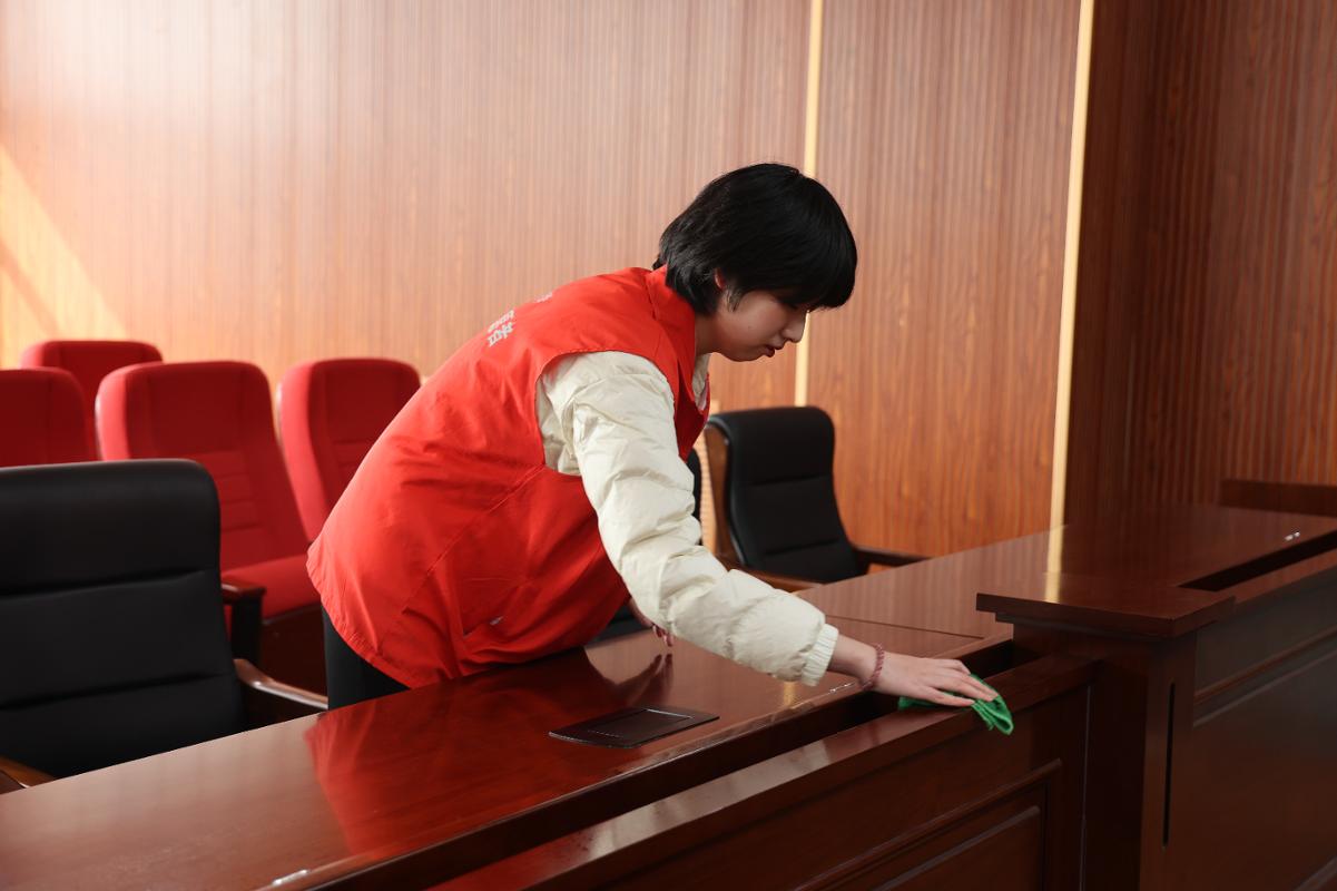 组织开展模拟法庭清扫与阅览室清洁志愿服务活动,志愿者们积极参与,用劳动为校园环境焕新添彩。
