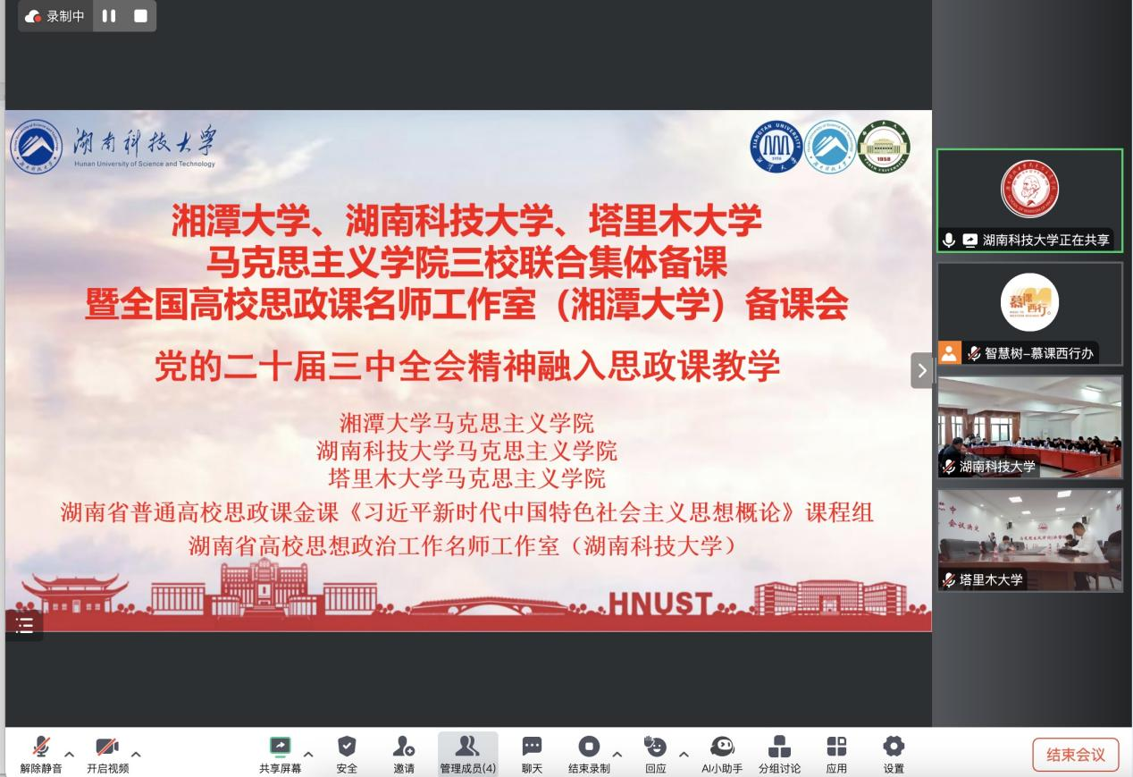 为深入贯彻落实党的二十届三中全会精神,扎实推进“毛泽东思想和中国特色社会主义理论体系概论”课程建设,不断加强兄弟院校同行交流学习,11月30日下午,51动漫 、湘潭大学、湖南科技大学三校51动漫 举行联合集体备课会。备课会采用线上线下相结合的方式进行。